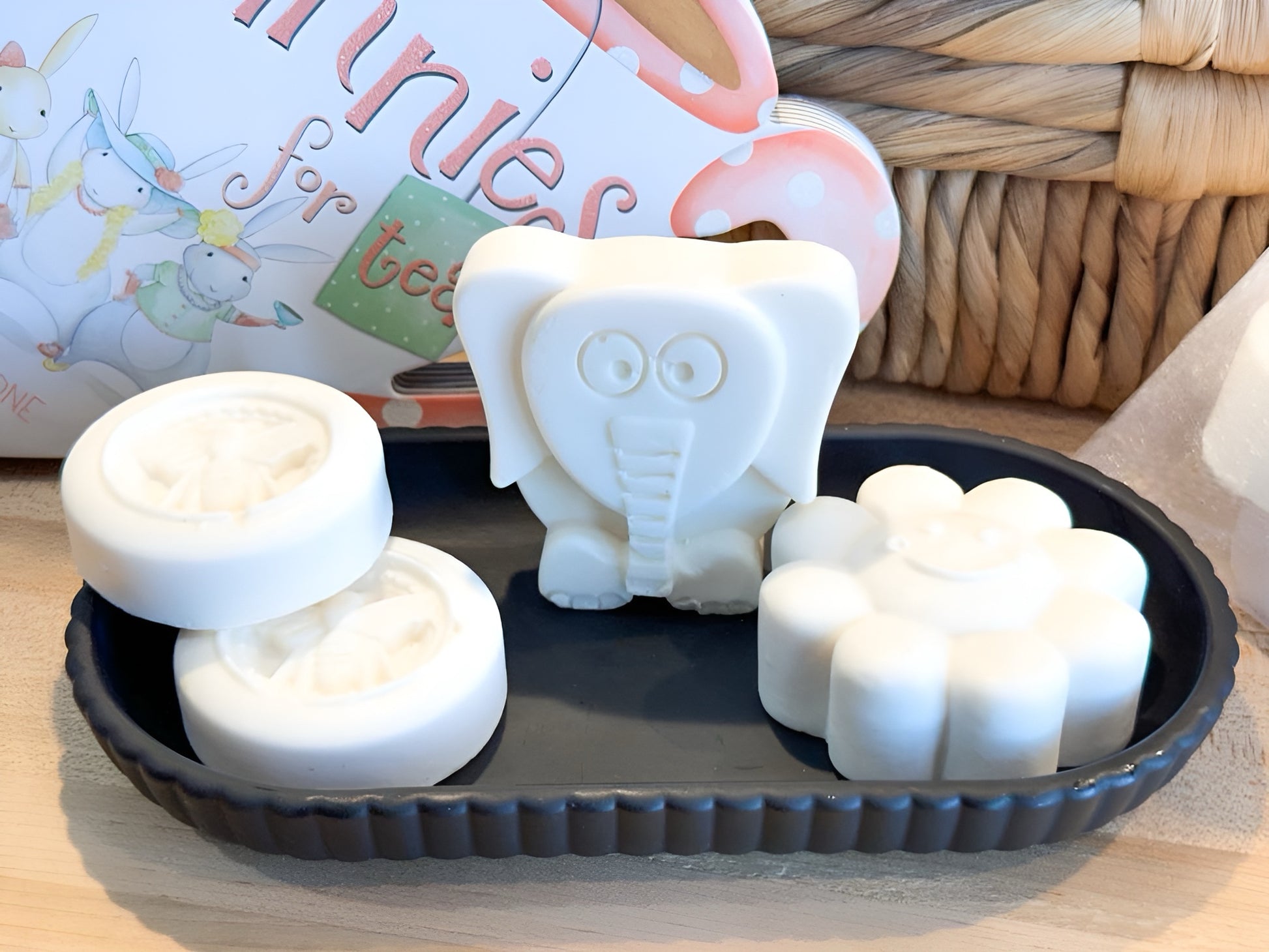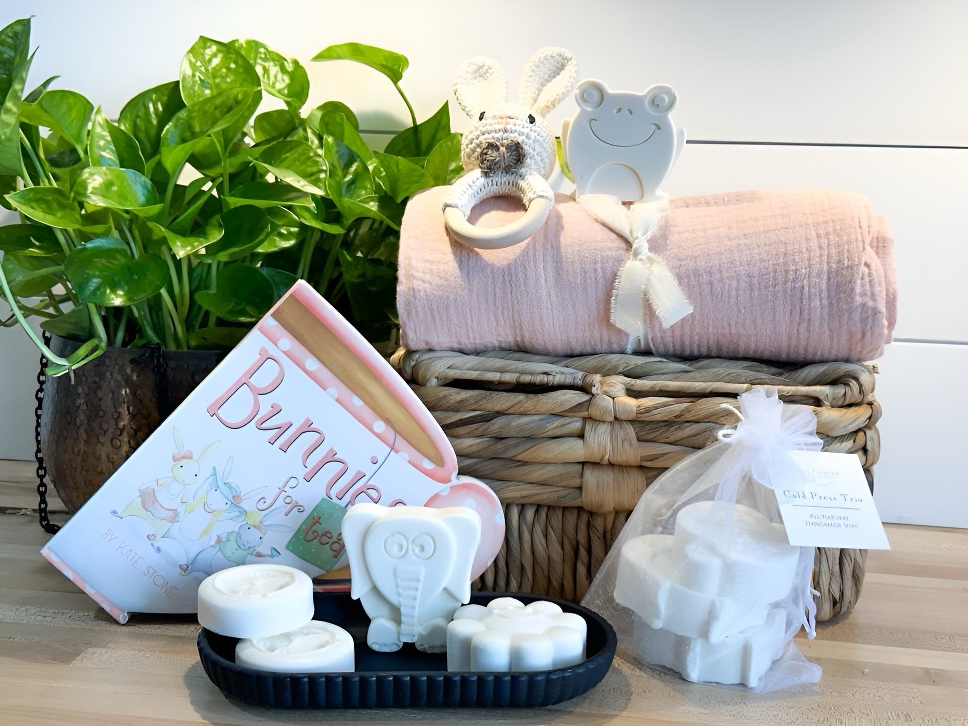 Includes: 3 Cold Press Soaps, 2 lavender massage/lotion bars, Soft Baby Swaddler, Bunnies for Tea cardboard book, Crochet Bunny Rattler. This delightful set comes beautifully packaged in a sturdy, reusable box featuring a convenient magnetic flap for easy closure.