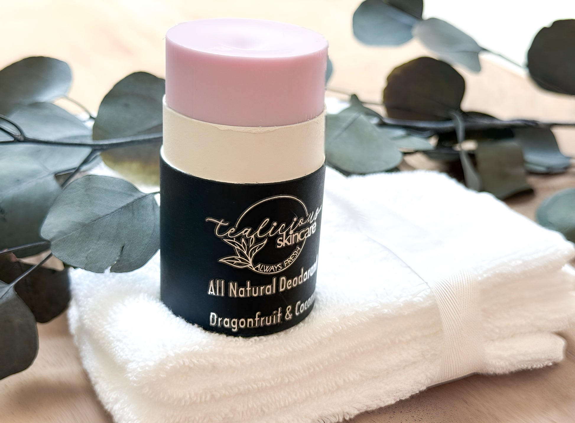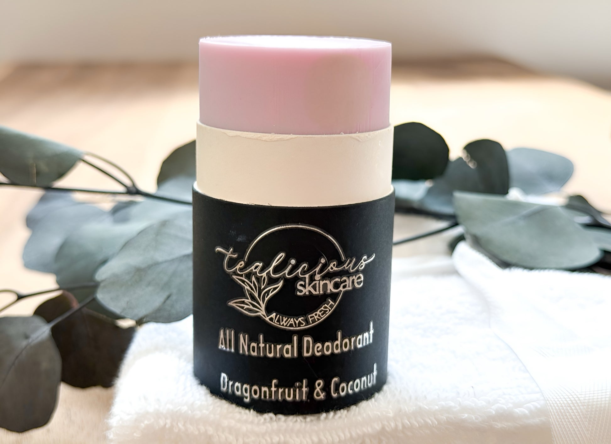 Tea-Licious Skincare’s all-natural Dragonfruit & Coconut deodorant blends dragonfruit’s vibrant, sweet-tart fragrance with coconut’s creamy, tropical warmth. This refreshing fruity scent neutralizes odor using natural ingredients, ensuring long-lasting freshness without synthetic chemicals. Its soothing, antibacterial properties and eco-friendly packaging deliver a luxurious, sustainable solution for confident odor protection.