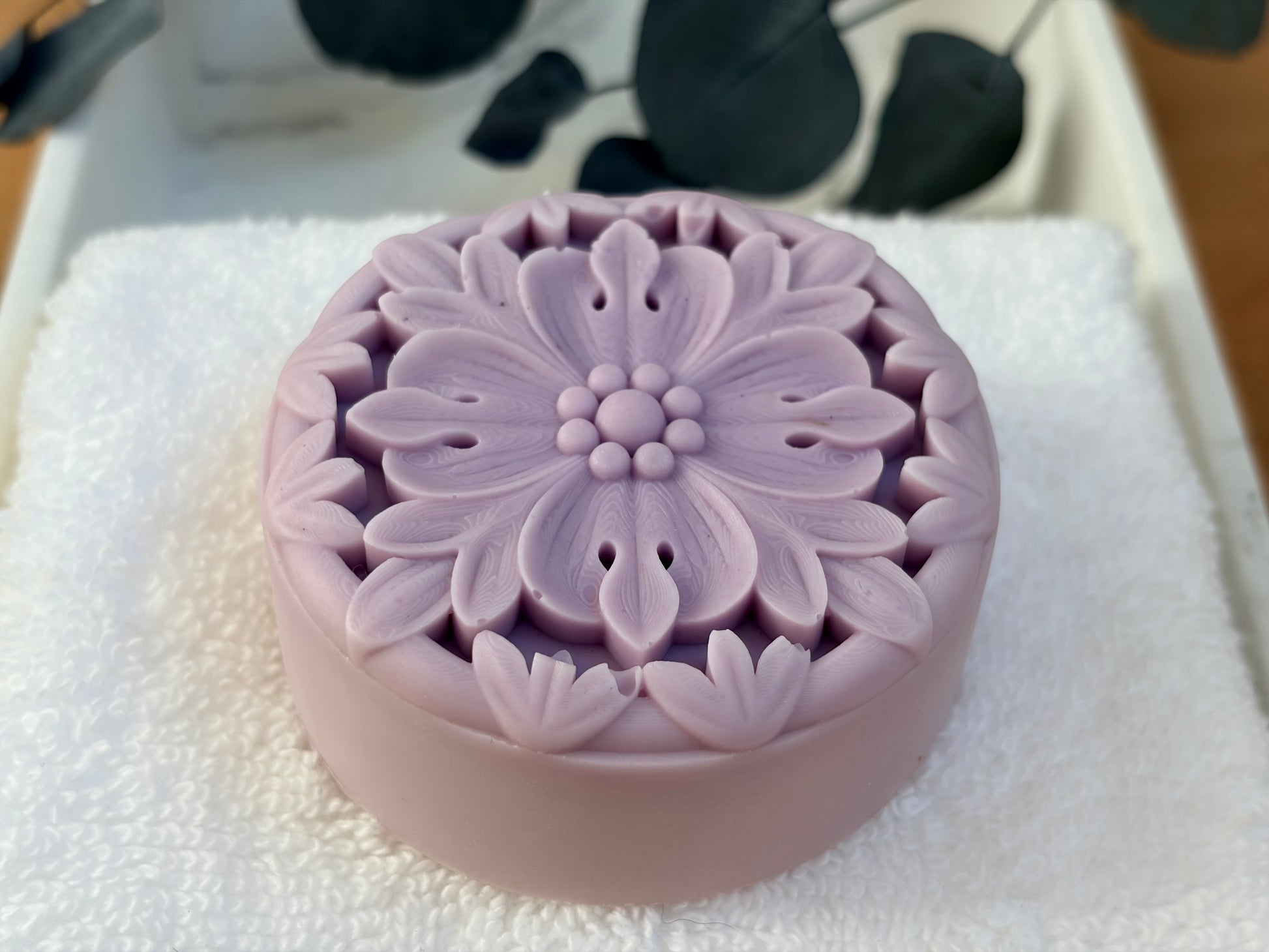 - Warm the comfortably shaped lotion bar in your hands for a few seconds to soften.