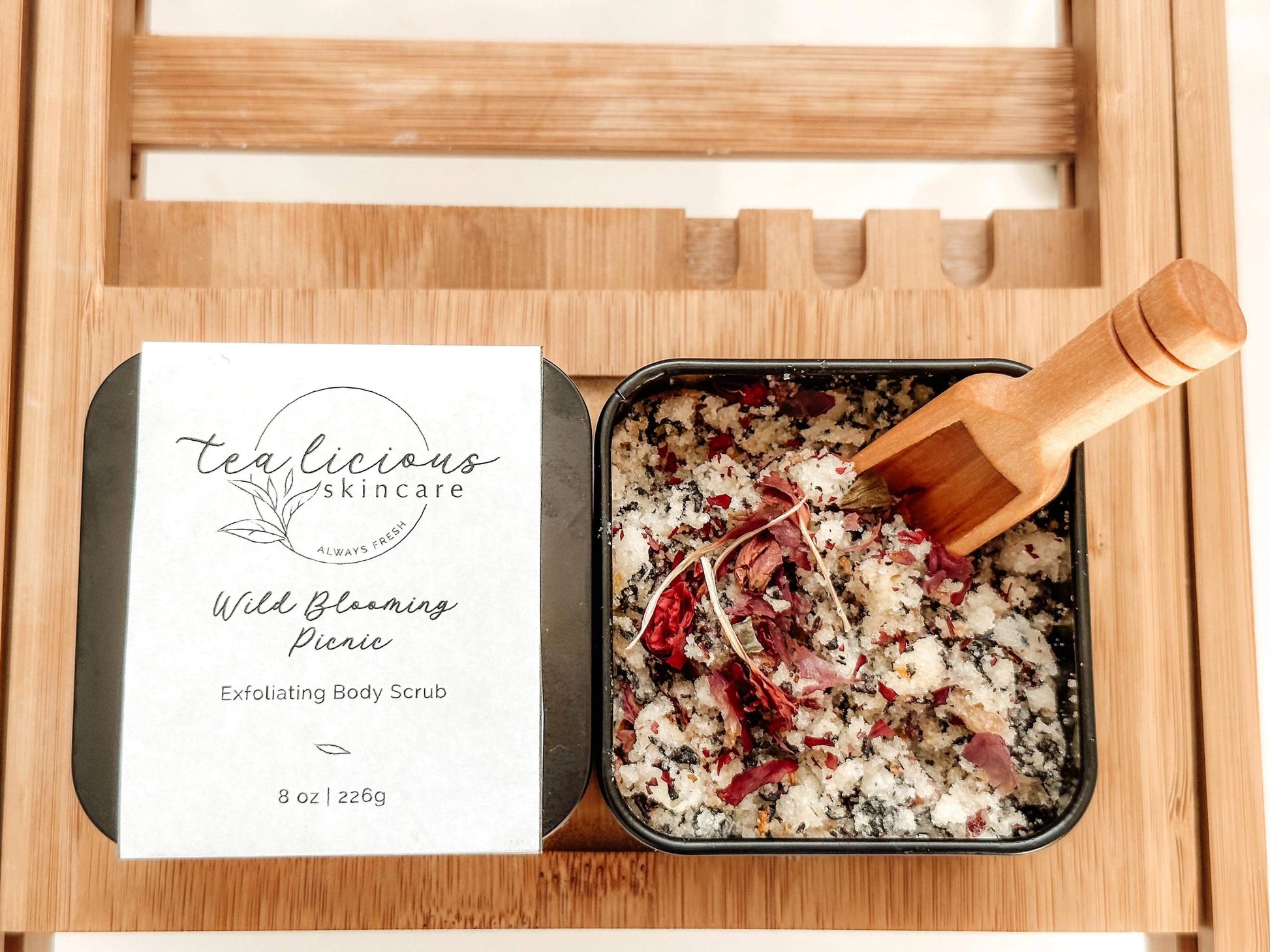 The Tea-licious Wild Blooming Picnic Body Scrub is a handcrafted, chemical-free, eco-friendly skincare product inspired by the vibrant essence of wildflowers and blueberry tea. This luxurious scrub uses Himalayan pink salt and apricot shell for gentle exfoliation, paired with nourishing ingredients to hydrate, improve skin texture, and boost elasticity. It exfoliates dead skin, and enhances circulation, leaving skin smooth, radiant, and hearthy. Packaged plastic-free, it’s free of parabens and sulfates. Not recommended for facial use due to the coarse exfoliants.